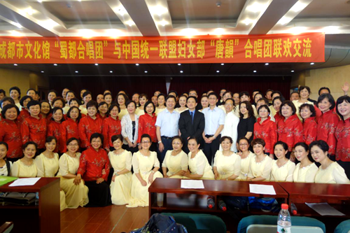 “台湾唐韵合唱团”与成都市文化馆“蜀都合唱团”交流。(图片来源:四川省台联)