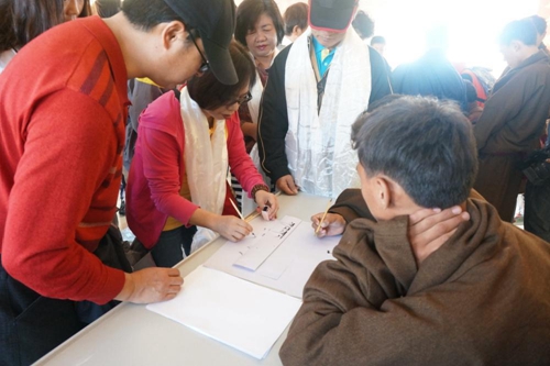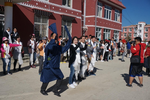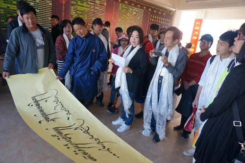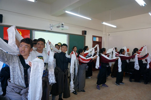 红原藏文寄宿制中学师生以藏族特有的敬献哈达、唱颂欢迎藏歌等方式,隆重迎接来自台湾的客人。学校校长华尔白带领台湾师生一行参观了学生创作的大型唐卡绘画、学校独具特色的文化装饰墙,现场观摩了师生的藏文书法(竹笔字)展示、大课间会操(锅庄)表演,并与台湾师生进行了座谈交流。