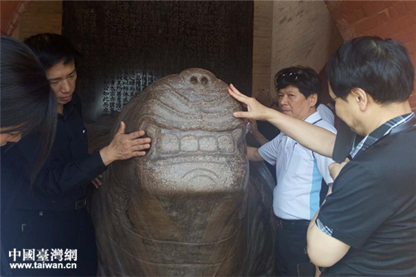 参访团成员抚摸龟趺讨吉利。(中国台湾网 刘畅 摄)