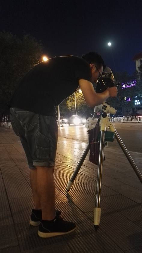 通过天文望远镜认真观看月亮的台湾同胞。(图片来源:河南省台办)