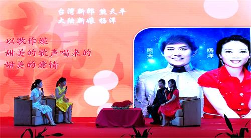 “你我风风雨雨守护一个圈,把爱团团圆圆围在心里面”,主题联谊活动在台湾艺人熊天平、杨洋夫妇动人的歌声中拉开序幕。一个是才华横溢的台湾艺人,他的《火柴天堂》、《夜夜夜夜》等歌曲脍炙人口;一个是热情奔放的北方妹子,也是一名创作型歌手。对音乐共同的热爱让熊天平和杨洋彼此牵手,并喜得一对龙凤双胞胎。谈到婚姻的相处之道,杨洋说就是六个字“求大同,存小异”。她说:“我擅长粗犷的‘大歌’,他擅长细腻的情歌,这和我俩的性格也很相似,我大气些,他细致些,这让我们在工作和生活中起到很好的互补作用。”成长环境和思维方式的差异难免会让婚姻产生摩擦,杨洋表示音乐是最好的“润滑剂”,“一言不和就唱歌,唱着唱着,矛盾就渐渐消除了”。而熊天平认为“沟通”是婚姻中最重要的部分。两岸婚姻有许多需要互相学习的方面,夫妻间更要包容和忍让,他笑言“老婆说的即使不合理的也是合理的”。访谈中,熊天平温文尔雅,话不多,杨洋则是快人快语,如同她身上的靓丽红衫。当两人现场清唱起那首耳熟能详的《你的眼睛》时,浓浓爱意融化了在场所有人。