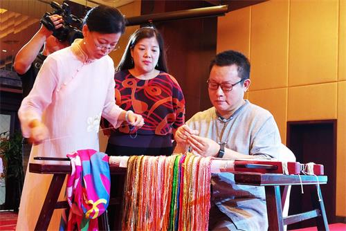 沈德龙是大陆刺绣界的翘楚,他的绣品《蒙娜丽莎的微笑》倾倒了许多人。但鲜有人知是他的妻子是来自台湾的英语老师。时间回到2003年,一位台湾客户来到沈德龙工作室参观,被他正绣着的一幅《贵妇人》所吸引,不停称赞“真像”。不久之后,这位客户带着自己的女儿苏嘉莉来到苏州,沈德龙一看,苏嘉莉长得正像他那幅绣品中的女子。回忆起两人相识的传奇经历,沈德龙话语中依然透着甜蜜,不时感慨缘分的神奇。如今,苏嘉莉除了在家相夫教子,也协助丈夫经营公司,是沈德龙得力的“贤内助”。他们生育了三个孩子,其中还有一对龙凤胎。三个孩子活泼可爱,三人志向各不相同,一个喜欢画画,一个喜欢书法,只有小女儿表示要“女承父业”,听着孩子诉说理想,夫妻二人眼中满是欣慰。活动现场,沈德龙展示了历时两年完成的长达六米的绣品《富春山居图》,他说:“黄公望的《富春山居图》现在分藏两岸,2011年才在台北迎来了合璧展出的历史性一刻。所以我想用这幅绣品展现这部巨作,寓意着两岸一家亲,希望两岸能像这幅《富春山居图》一样早日合璧!”