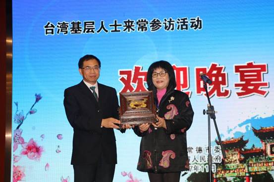 陈位明副主席与侯彩凤女士互赠礼品。(图片来源:常德市台办)