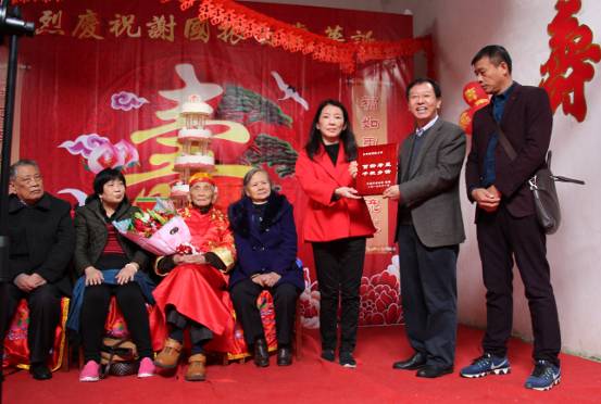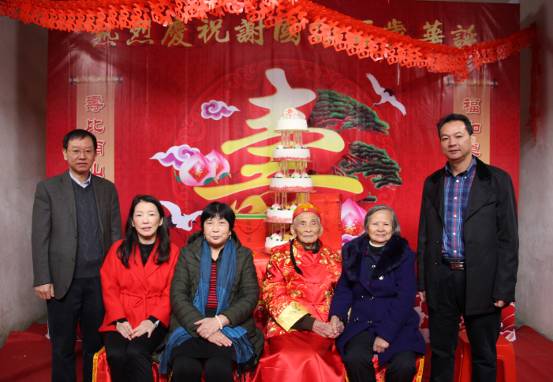 当天,谢国振先生的祖屋张灯结彩,喜气洋洋,其台湾的家人妻子、女儿相伴回乡,韶关市南雄县的家人孙子、曾孙等首次回到故乡上坪,庆寿百龄,拜祖团聚,四世同堂,畅叙亲情,其乐融融。河源市台办、河源市台联会、连平县台办、上坪文促会、上坪群贤奖教助学协会派员参加庆典和祝贺。