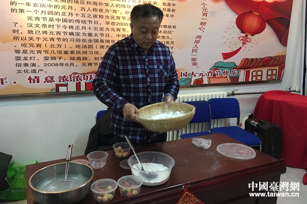民俗专家李石在右安门街道现场摇元宵。(中国台湾网 李瑞艳 摄)