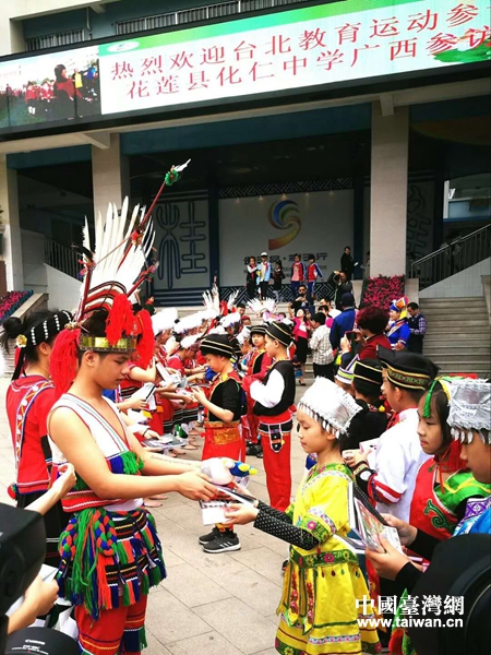 中国台湾网4月18日南宁讯 “三月三”是壮族地区最为隆重的民族传统节日和歌圩日。4月16日,台北教育运动访问团及台湾花莲县化仁中学原舞队一行65人到广西南宁青秀区桂雅路小学开展“相约壮乡三月三 民族团结一家亲”桂台校园民族文化交流活动。