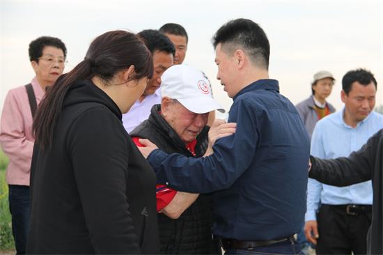 4月21日上午,金贵发老人携妻儿在家乡亲属的陪同下分别来到父母和兄弟坟前祭祖,金贵发终将数十年思绪宣泄,泣不成声。在母亲的坟头,他含着泪水,深情地表白道:回家的路太漫长了,明年我还会回来,为您立碑。