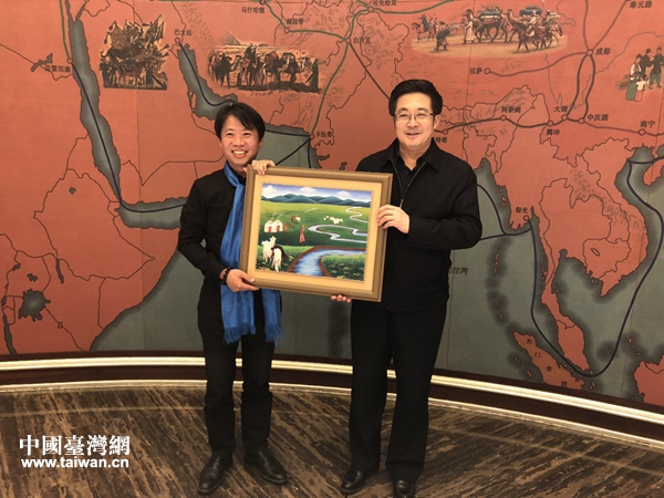 自治区台办主任杨利民(右)向何溢诚先生(左)赠送宣传品。(图片来源:内蒙古台办)