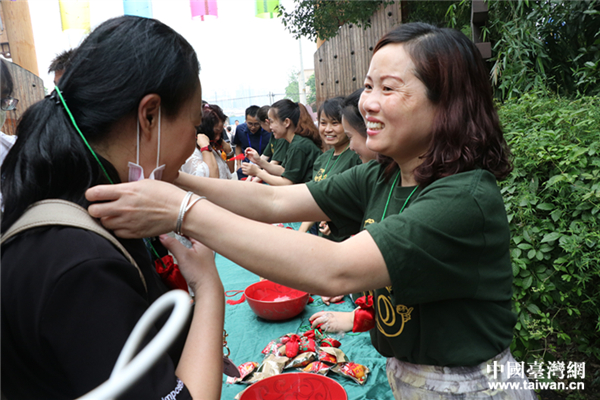 工作人员向参加活动的民众佩戴用艾草制作的福包。(中国台湾网 郜利敏 摄)