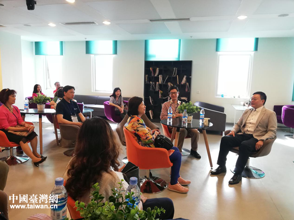 成都台协常务副会长暨青委会主任张荣华向参访团介绍德阳青创园相关情况。(图片来源:四川省台联)