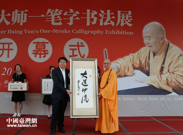 中国台湾网5月31日贵阳讯 5月26日,“星云大师一笔字书法展”——2018中国大陆巡回展首站登陆贵阳,在贵州美术馆隆重开幕。这是去年9月,贵州省“守望精神家园”非物质文化遗产赴台湾展演交流所取得的硕果之一,也是贵州省深入贯彻中央“推动两岸同胞共同弘扬中华文化,促进心灵契合”精神的具体举措,是一场精彩绝伦和震撼人心的涉台文化盛宴。