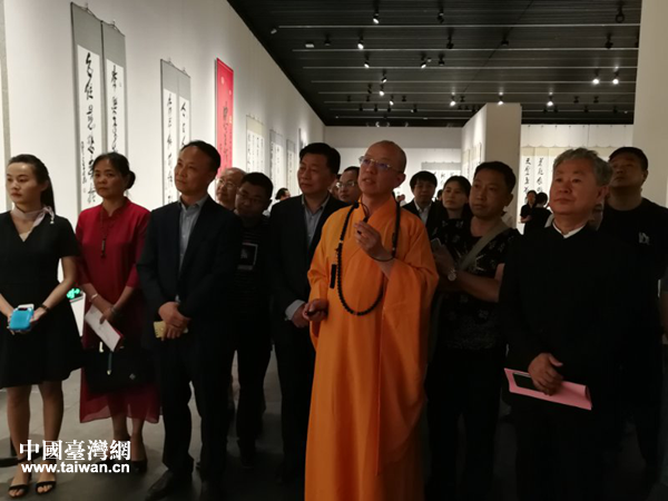 星云文化教育公益基金会监事长、北京光中文教馆馆长慧宽法师介绍作品。(图片来源:贵州省台办)