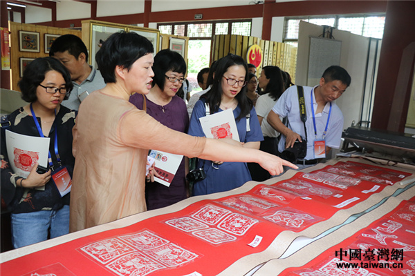 两岸媒体走进鄂州民间工艺美术馆,参观雕花剪纸、麦秆画等民间工艺品,了解鄂州市传统文化。(中国台湾网 郜利敏 摄)