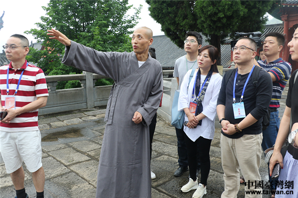 两岸媒体记者聆听法师讲述四祖寺的禅宗渊源。(中国台湾网 郜利敏 摄)