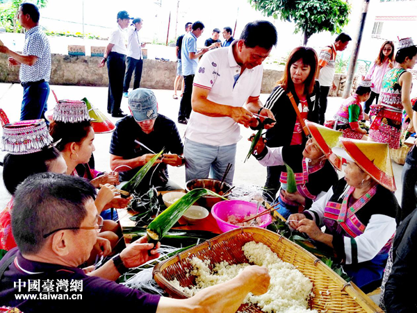 中国台湾网6月20日玉溪讯 6月16日上午,正值端午佳节到来之际,参加第七届云台会的台湾澎湖县嘉宾一行14人来到云南省玉溪市新平县戛洒镇平寨村,与当地村民共度端午节,一起包粽子,吃傣族农家饭,浓浓的血脉亲情在两岸民众共同的节日习俗中传递。(中国台湾网、玉溪市台办、新平县台办联合报道)