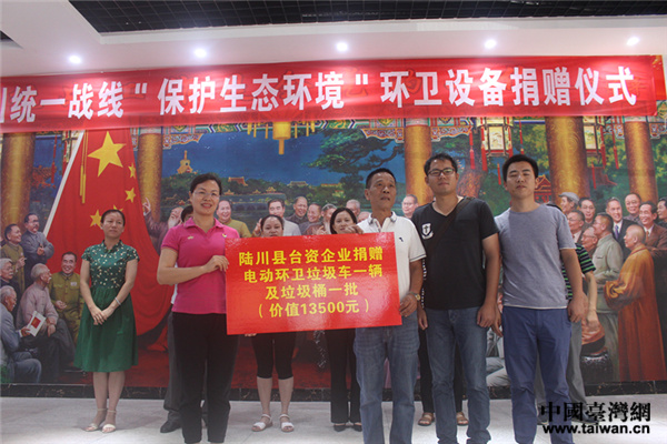 中国台湾网6月20日陆川讯 6月15日,广西玉林市陆川县开展“保护生态环境,统一战线在行动”系列专题活动,该县7家台资企业积极响应,参与当地生态文明建设,并捐赠价值13500元的电动环卫垃圾车一台及垃圾桶一批。捐赠后,台资企业代表还前往该县温泉镇官田村开展清河大行动。