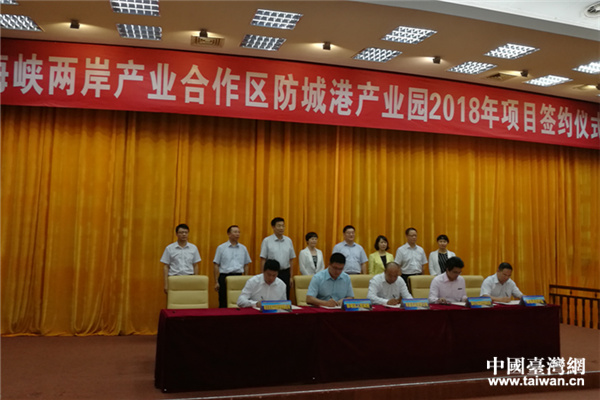 中国台湾网6月27日防城港市讯 6月21日,广西海峡两岸产业合作区防城港产业园2018年项目签约仪式在广西防城港市举行,台资企业佛山锡山家俱有限公司、上海冠龙阀门机械有限公司、富味乡油脂食品有限公司、北部湾祥盛实业有限公司等7个项目签约,总投资约136亿元人民币,涉及农林牧渔、先进制造、食品加工、健康养生、商贸物流、现代服务业等多个领域。广西台办主任李东兴,防城港市委书记李延强,防城港市市长班忠柏,副市长蹇兴超出席签约仪式。
