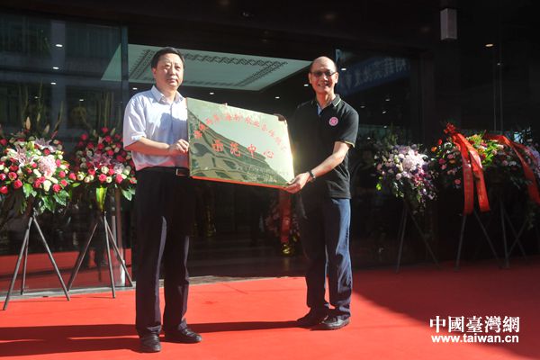 海南省台办主任刘耿(左)向台商张岳玄授予“海峡两岸(海南)农业合作服务中心“牌匾”。(图片来源:海南省台办)