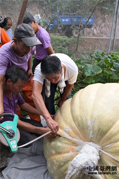 台湾“南瓜达人”徐沧浩在梅州种出1040斤南瓜,或创中国最重南瓜纪录。(图片来源:梅江区台办)