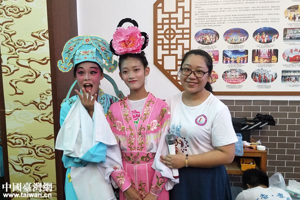 两位台湾学生在台上向大家展示粤剧学习成果。(图片来源:梧州市台办)