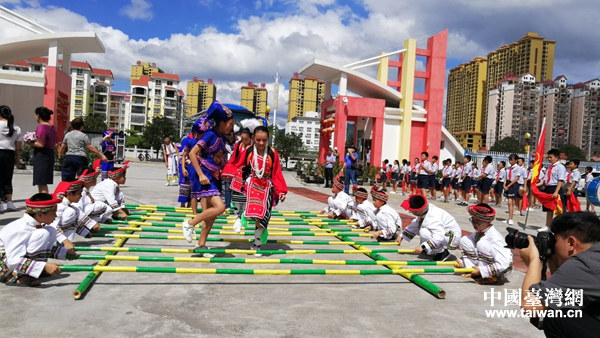 图为广西都安小朋友与台湾小朋友跳竹杆舞。(图片来源:广西河池市都安县台侨办)