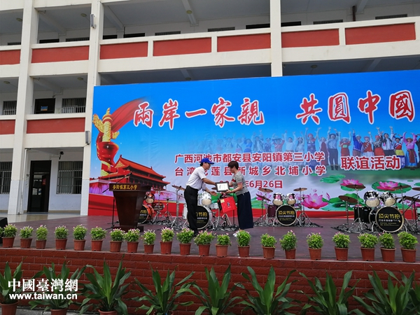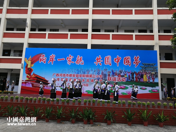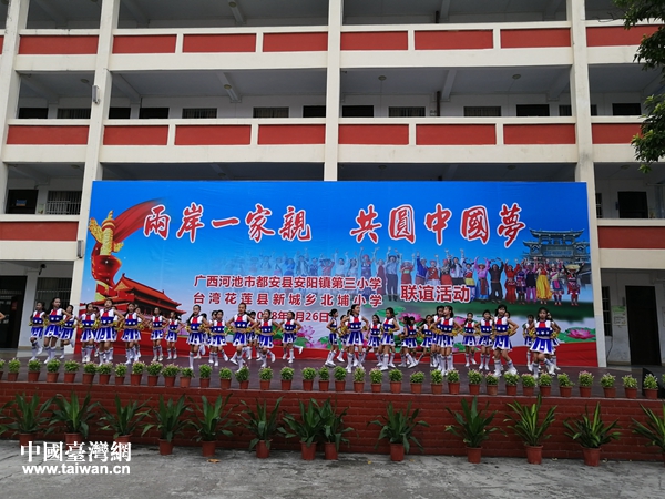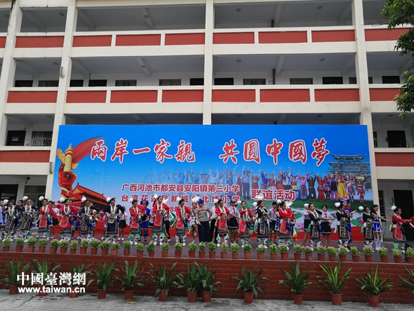 中国台湾网7月2日河池讯 6月26日,激昂的鼓点、优雅的歌声、台湾少数民族韵味的音乐、气势如虹的武术表演叱喝声、欢快的笑声和掌声,在广西河池市都安县安阳镇第三小学校园内荡漾,这是台湾花莲县新城乡北埔小学师生一行30人到该校开展联谊交流活动的欢乐场景。