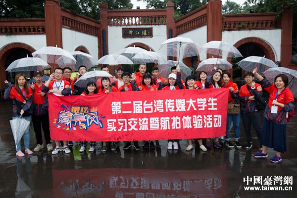 川台学子在都江堰合影留念。(图片来源:四川省台办)