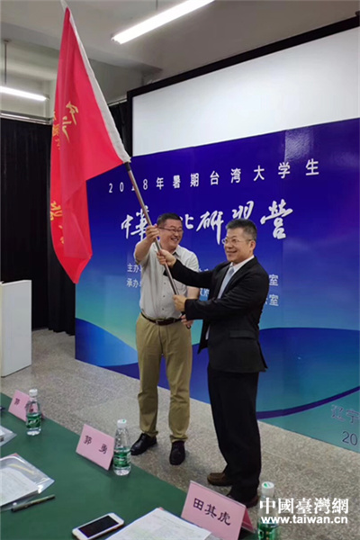 省台办交流处处长郭彬(左1)向台湾代表授营旗。(图片来源:辽宁省台办)