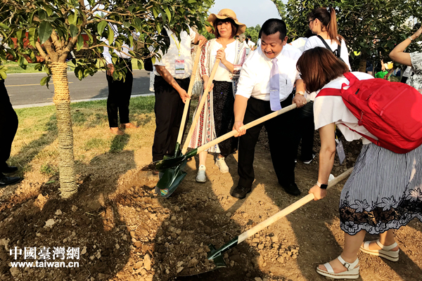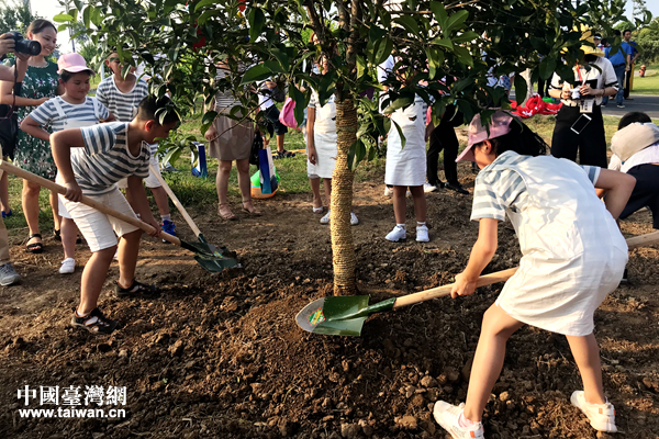 两岸青少年代表及家长代表携手种下同根树。(中国台湾网 赵苗青 摄)