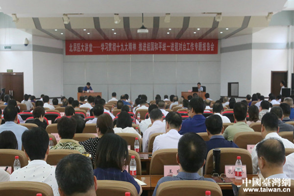 中国台湾网7月27日北辰讯 为全面学习贯彻党的十九大精神和习近平总书记新时代对台工作重要思想,切实提高领导干部处理对台问题的政策能力水平,不断推进全区对台工作再上新台阶,近日,天津市北辰区举办“北辰区大讲堂——学习贯彻十九大精神 推进祖国和平统一进程”对台工作专题报告会。区长王宝雨,区人大常委会主任王志平,区委办公室主任陈健等区领导出席,全区处级领导干部约400人参加。报告会由区委常委、统战部部长陈永义主持。