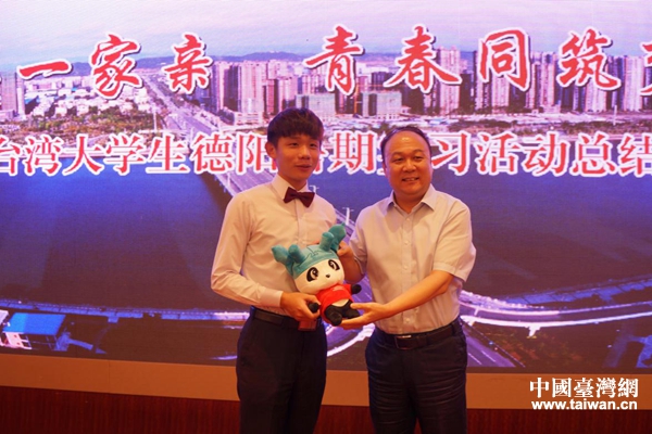 德阳市委常委、市政府副市长王斐(右)为台湾大学生赠送实习纪念品。(图片来源:德阳市台办)