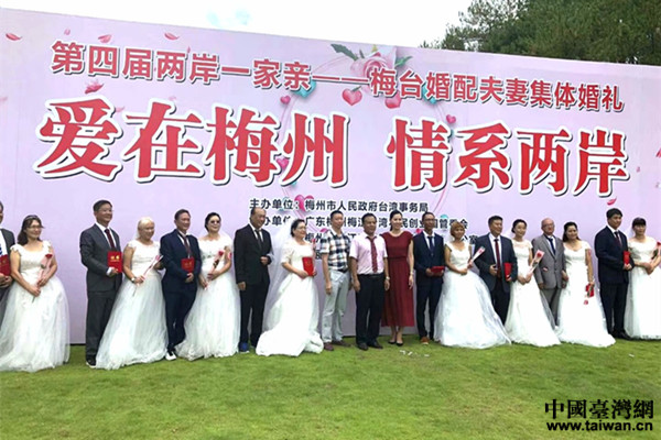 中国台湾网8月15日梅州讯 8月10日上午,“爱在梅州 情系海峡”第四届两岸一家亲·梅台婚配夫妻集体婚礼在海峡两岸交流基地示范点广东省梅州市梅江区城北镇爱丽丝庄园举行。15对梅台婚配夫妻在亲友团的共同见证下步入婚姻殿堂。