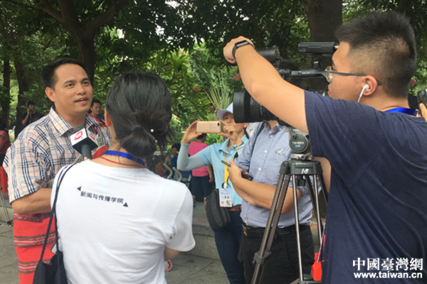 来自台湾少数民族的青年代表林金龙接受媒体采访。(图片来源:广州市台联)