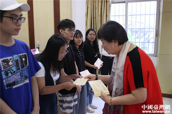 中杰公司刘何玉铃向学生发放助学金。(图片来源:肇庆市台办)