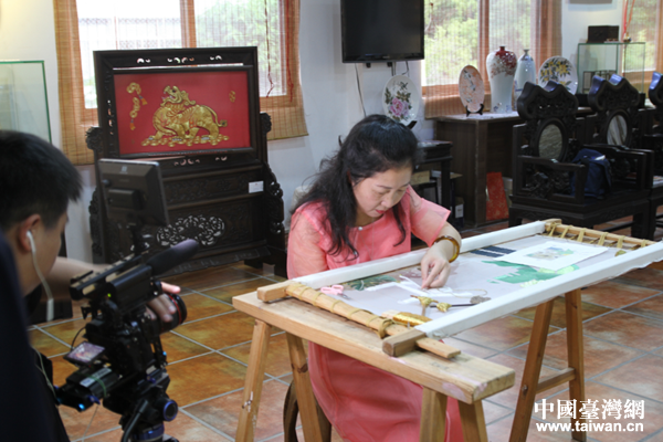 非遗项目抽纱、潮绣、珠乡传承人洪静裕现场演示高超技艺。(图片来源:汕头市台办宣传交流科)