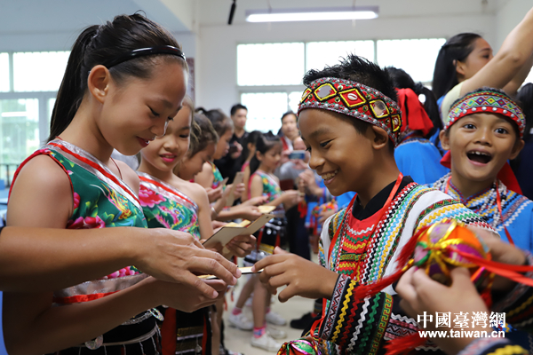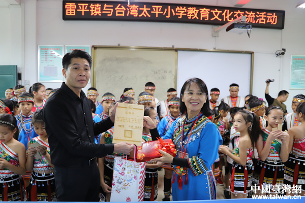 大新县雷平镇中心小学与台湾花莲太平小学交换礼品。(图片来源:广西台办)