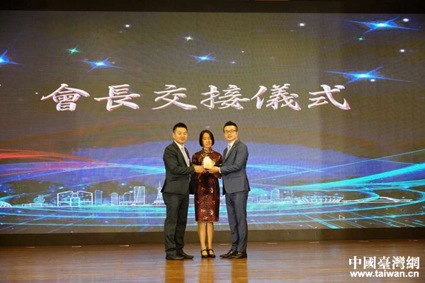 在佛山市委台办主任香秀杏(中)的见证下,詹正兴(右一)从第二届会长刘伟立(左一)手中接过会长印鉴。(图片来源:佛山市台办)