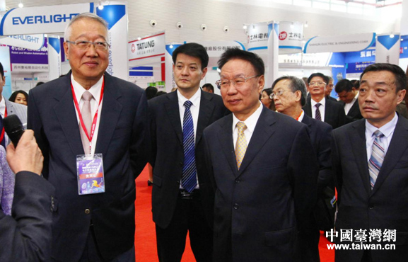 海峡两岸关系协会副会长李亚飞、台湾电电公会理事长郭台强等领导、嘉宾巡馆。(图片来源:安徽省台办)