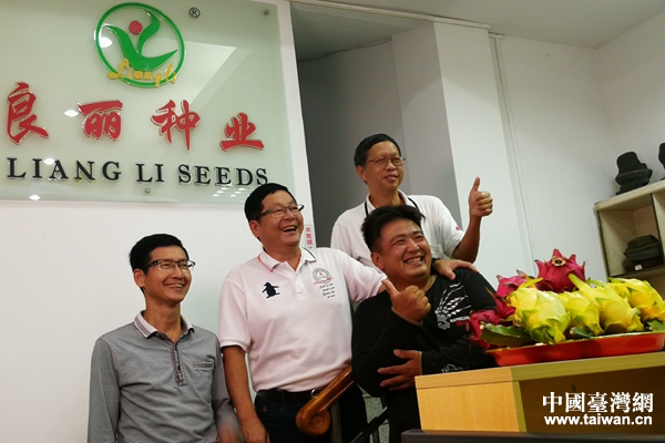 南宁市台协副会长、南宁良丽种业公司董事长林金良与弟弟林水德、志同道合的台湾农业专家郭明生、陈胜得一起展露出“丰收喜悦”的甜蜜笑容。林金良表示,1992年来到南宁开展台湾优质水果的培育、种植,培育出的大汇红等优质红(火)龙果在广西得到大面积推广种植,经济和社会效益良好,目前正在培育良丽金元宝黄龙果等新品种,很有成就感和满足感。