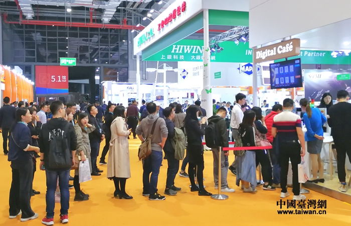进博会现场展区,参观者排队体验新科技产品。(上海市台办 常常 摄)