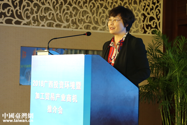 中国台湾网11月12日苏州讯 11月6日,“2018年广西投资环境暨加工贸易产业商机推介会”在江苏省苏州市举办,广西台办主任李东兴作推介发言,向与会120多家台资企业负责人推介广西海峡两岸产业合作区的规划背景、区域范围、发展定位、发展目标、突出优势、合作领域和优惠政策。