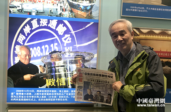 站在注释为“北京市举办两岸直接通邮仪式”的照片前,在京台胞徐波的心情格外激动。图片记录了2008年12月15日两岸实现空中直航、海上直航、直接通邮后,徐波的父亲、在京台胞郑坚将寄往台湾的家书投入邮筒的珍贵历史瞬间。这也是两岸隔绝三十多年后,郑坚第一次不用再通过美国、香港等第三地辗转,直接给台湾的亲人寄信。