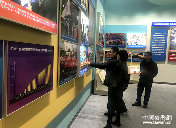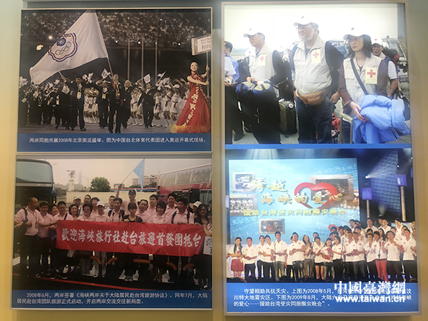 展区展出的记录两岸交流交往重要时刻的图片。(中国台湾网 普燕 摄)