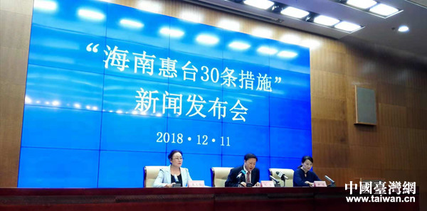 中国台湾网12月11日海口讯 12月11日,在“海南惠台30条措施”新闻发布会上,海南省发布了《中共海南省委统一战线工作部 海南省发展和改革委员会 贯彻落实〈关于促进两岸经济文化交流合作的若干措施〉实施意见》(简称“海南30条惠台措施”)。“海南30条惠台措施”的出台旨在深入贯彻党的十九大精神和习近平总书记关于对台工作重要论述,与台湾同胞分享建设中国(海南)自由贸易试验区、中国特色自由贸易港发展机遇,让台湾同胞在海南投资、创业、就业、学习和生活有更多的获得感。