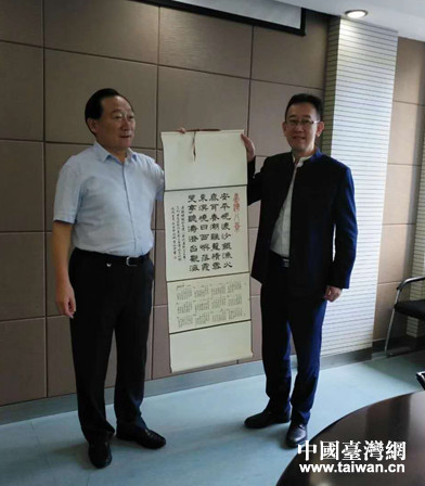 韦仰哲先生向薛城区政府党组副书记王明先馈赠墨宝。(图片来源:枣庄市薛城区台办)