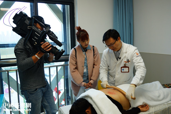 摄制组对刮痧技法进行采访。(图片来源:广西南宁市台办)
