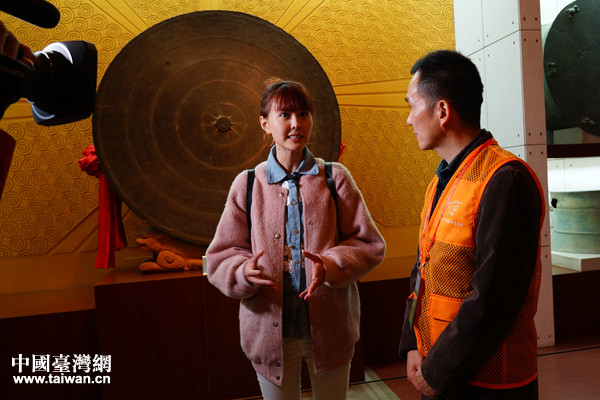 在“铜鼓之王”前采访。(图片来源:广西南宁市台办)