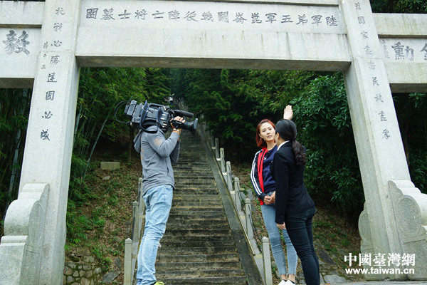 摄制组在昆仑关战役遗址采访南牌坊。(图片来源:广西南宁市台办)