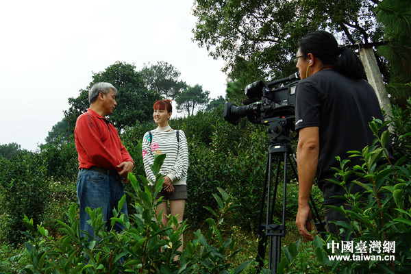 采访横县茶厂老厂长黄锦河。(图片来源:广西南宁市台办)