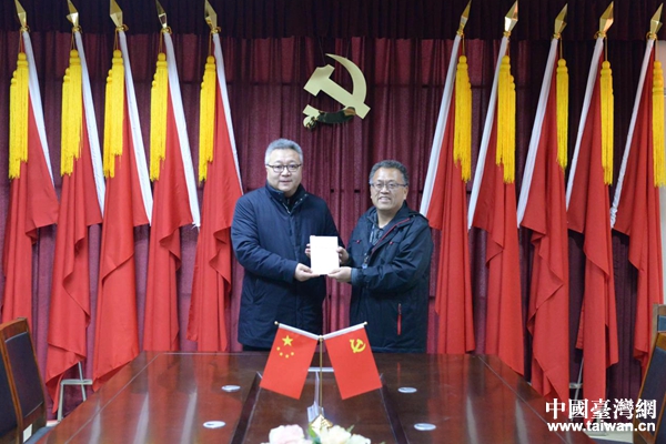 武汉市台办主任刘红鸣给台企送《惠台政策选编》。(图片来源:武汉市台办)